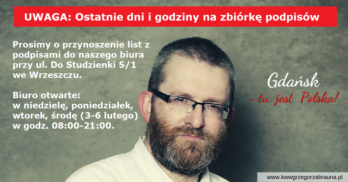Totalna mobilizacja! Prosimy o jak najszybsze przynoszenie podpisów do naszego biura przy ul. Do Studzienki 5/1 we Wrzeszczu. Ostateczny termin na przyniesienie podpisów to środa 6 lutego godz. 21.00. Biuro czynne w poniedziałek, wtorek, środę (4-6 lutego) w godzinach 08:00-21:00. Można też złożyć podpis indywidualnie na miejscu w biurze.